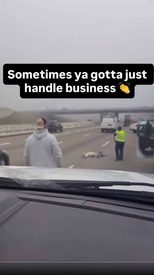 Then, out of nowhere, a man in a gray hoodie stepped out of his truck. He didnโt hesitate. He didnโt wait for someone else. He just walked straight into the middle of the road.